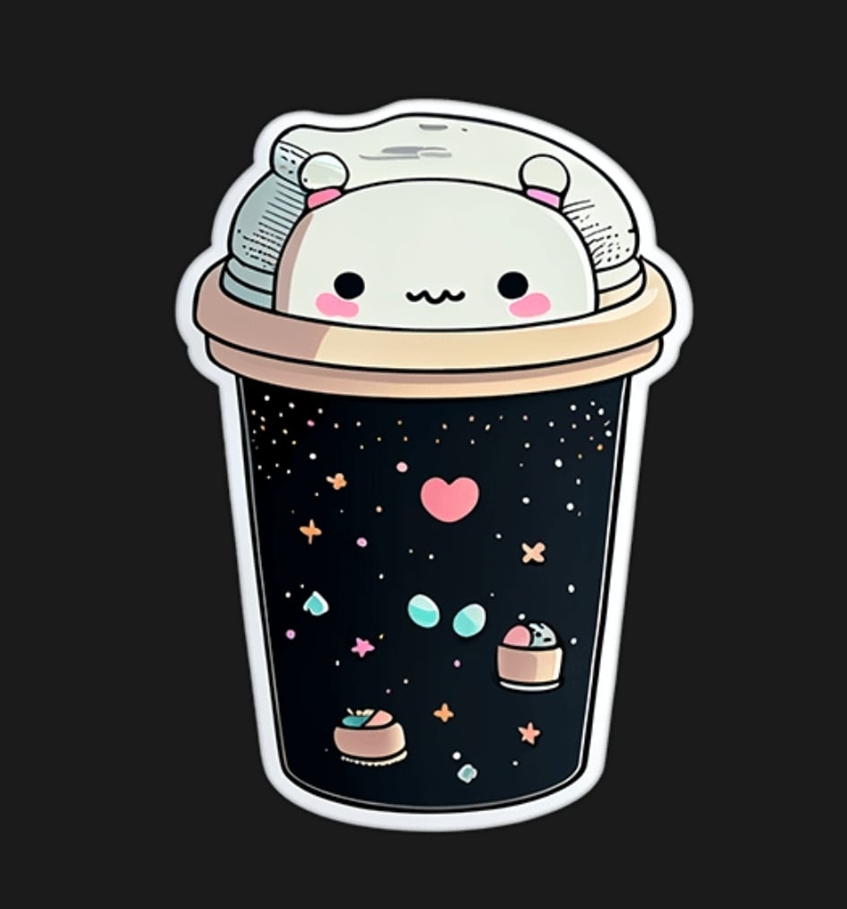 This Cartoon style black kawaii cup sticker features a cute and quirky design that is sure to add a touch of fun to any surface. The sticker features a black cup with adorable, wide eyes and a quirky expression that is sure to bring a smile to anyone's face. The cup is surrounded by pastel-colored hearts and stars, creating a playful and whimsical aesthetic. Perfect for decorating laptops, water bottles, notebooks, and more, this sticker is made from high-quality vinyl and is both water and scratch resistant. Whether you're a fan of kawaii style or simply looking for a fun and unique way to personalize your belongings, this Cartoon style black kawaii cup sticker is sure to be a hit.